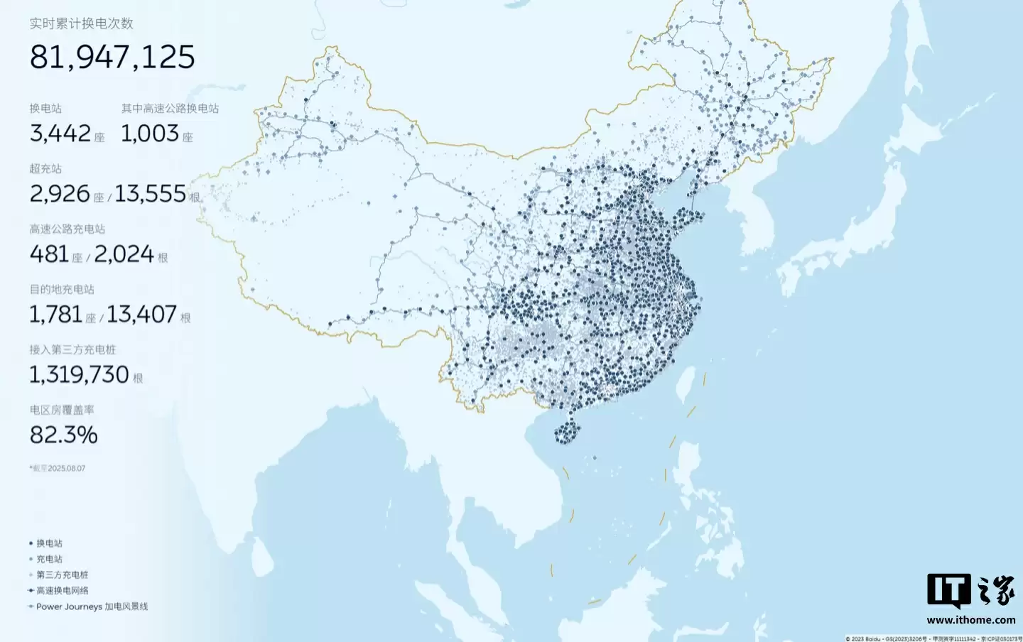 蔚来最新数据显示:公司目前已建成换电站3442座,其中高速公路换电站突破1003座;超充站2926座配备13555根超充桩;在481座高速公路充电站部署2024根充电桩;1781座目的地充电站配备13407根充电桩;同时接入131万9730根第三方充电桩。截至2025年8月7日,蔚来"电区房"覆盖率已达82.3%。