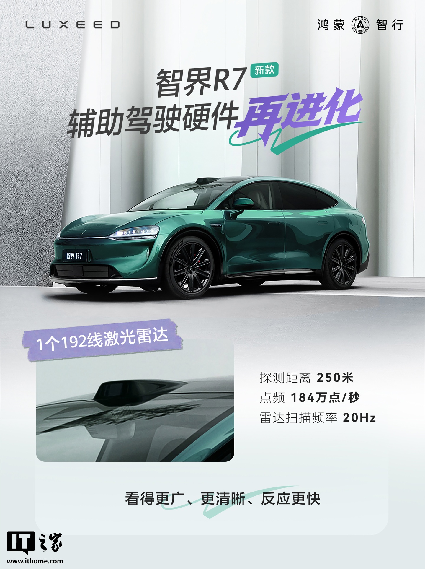 8 月 7 日消息,鸿蒙智行智界汽车官方微博昨日发布了智界 R7 轿跑 SUV 辅助驾驶硬件升级亮点。新车确认全系标配 192 线激光雷达 + 4D 毫米波雷达 + 后向高精度固态激光雷达,搭载 HUAWEI ADS 4 辅助驾驶系统。