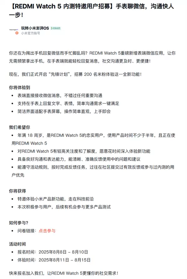 8月9日消息,小米官方账号@玩转小米澎湃OS 发布了“REDMI Watch 5内测特邀用户招募”。