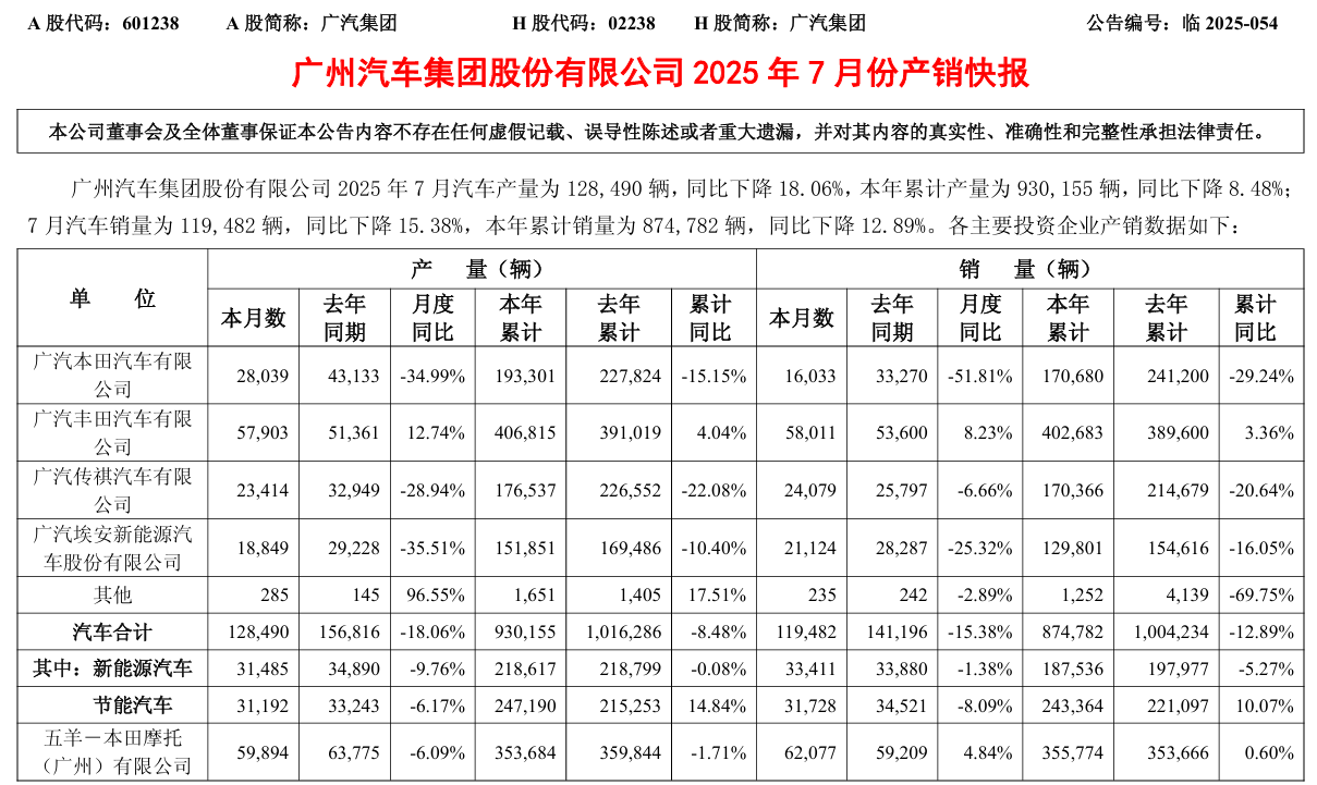 8 月 8 日消息,广汽集团今日发布 2025 年 7 月产销快报: