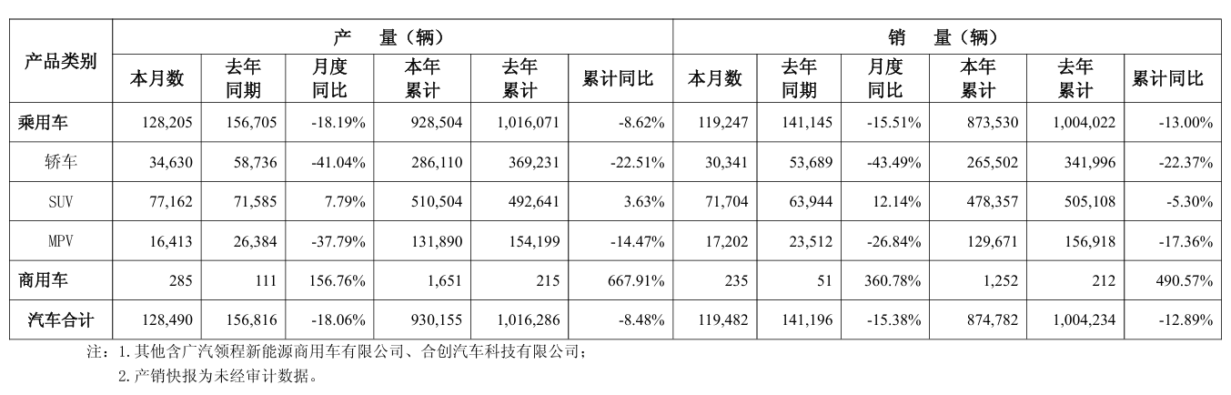 广汽集团公告称,面对严峻复杂的市场形势,为促进经营改善和可持续发展,公司制定了三年“番禺行动”。上半年,公司大力实施自主品牌一体化运营改革,积极采取多项措施统筹推进改革创新和转型升级,为业绩企稳回升奠定良好基础,“稳合资、强自主、拓生态”工作取得初步成效,合资企业广汽丰田汽车有限公司产销恢复正增长。