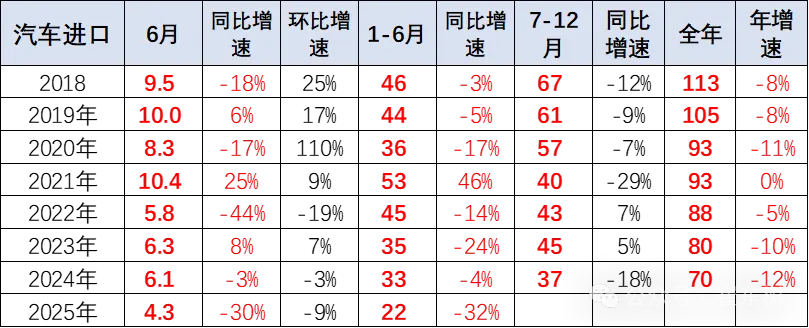 其中 2025 年 6 月进口车 4.3 万台,同比下滑 30%,环比 5 月下降 9%。报告指出这一下滑趋势从 2014 年进口车达到峰值后开始,尽管 2016-2017 年有所企稳,但自 2018 年以来,进口车市场持续下滑。附上相关图片如下:
