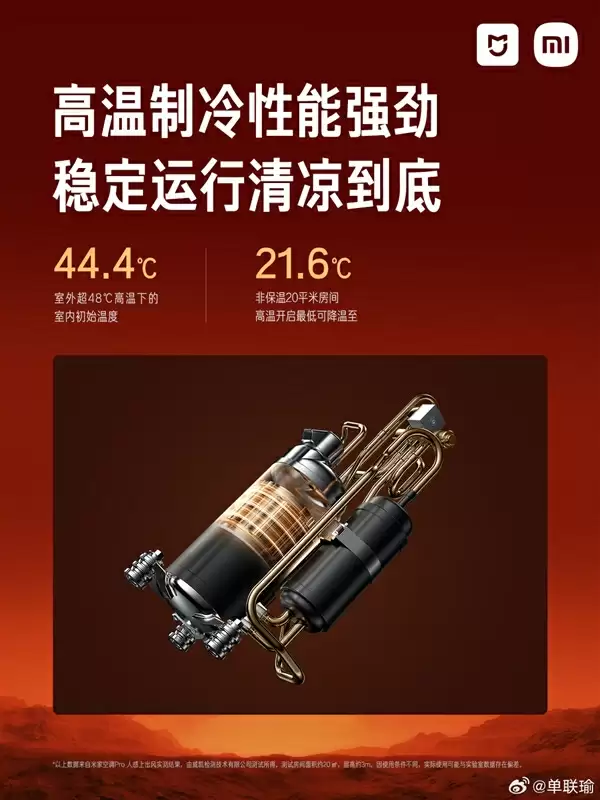 在降温性能方面,当室外温度突破48℃,室内初始温度达到44.4℃时,米家空调Pro在非保温的20平米空间内运行,最低可将室温降至21.6℃。