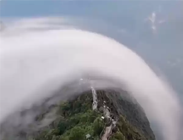 8月8日消息,据媒体报道,近日贵州六盘水,游客爬上老王山后遇见罕见云瀑,云层越过山源源不断倾泻而下。