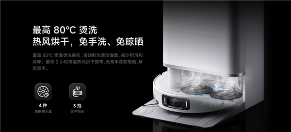 自清洁方面,基站支持80℃高温烫洗、2小时快速烘干、底盘自动刮洗,75天免倒垃圾,上下水版更可自动换水加清洁剂,彻底解放双手。
