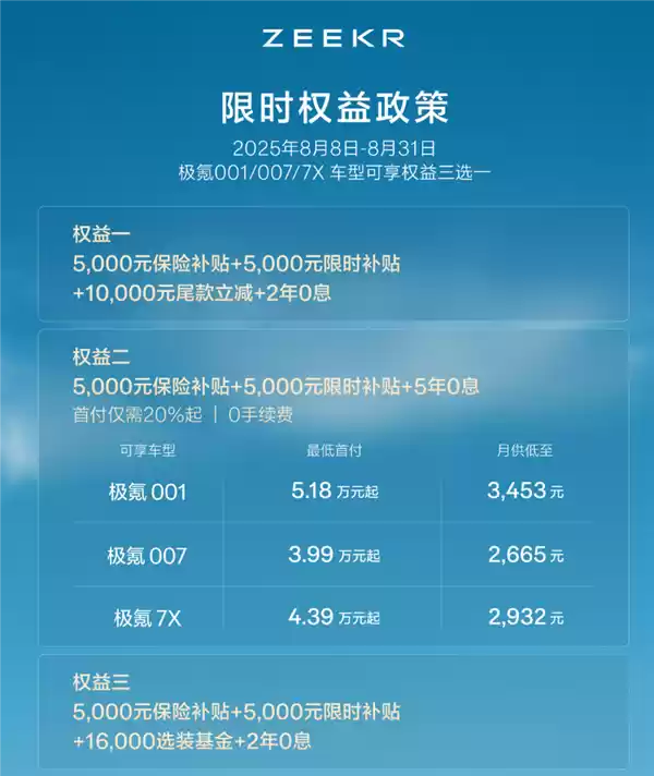 值得注意的是,在产品更新过渡期间,针对极氪X、007、001、7X的现款车型,极氪同步推出了包含5年免息金融政策在内的多项限时权益。
