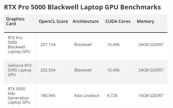 在性能方面,RTX Pro 5000 Blackwell移动版在OpenCL测试中获得了207,154,比其前代产品RTX 5000 Ada移动版快了14%。