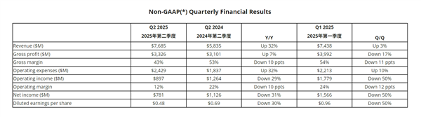 根据AMD的数据,Q2营收77亿美元,同比增长32%,高于分析师预期的74.3亿美元,运营利润率40%,同比下降了10个点,这主要是跟MI308加速卡之前被禁出口有关,