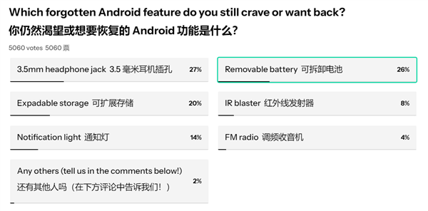 近日,Android Authority进行了一项调查,询问大众最怀念的被安卓手机所放弃的功能是什么,目前已经有超过5000名网友参与投票。