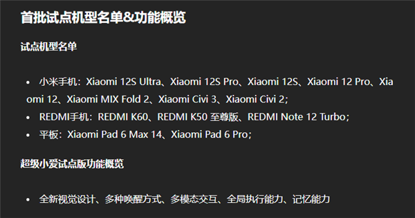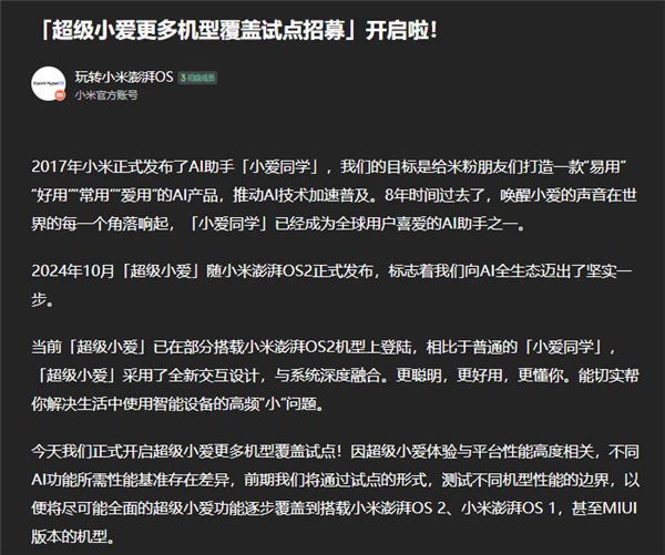今日,小米官方在小米社区宣布正式开启超级小爱更多机型覆盖试点。