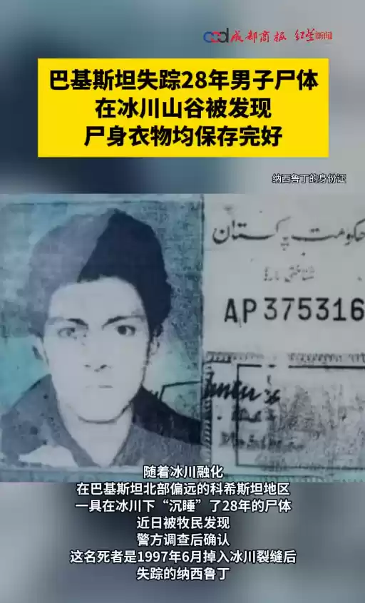 令人惊讶的是,尸体旁放置的身份证清晰显示主人为"纳西鲁丁"。经警方调查核实,确认这正是1997年6月在冰川失踪的当地居民纳西鲁丁。其家属对此予以证实,一宗尘封27年的人口失踪案终于水落石出。