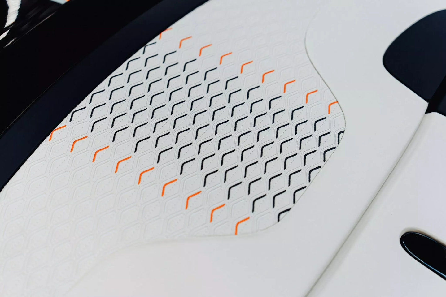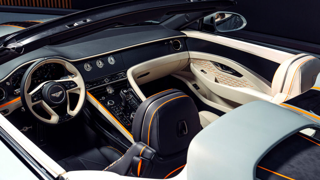 此外,方向盘拨片、雨刷拨杆及出风口均采用实心钛金属打造,Alcantara 软质材料覆盖驾驶侧,搭配亚麻色与橙色缝线,后排空间设有两个量身定制的皮革行李袋。