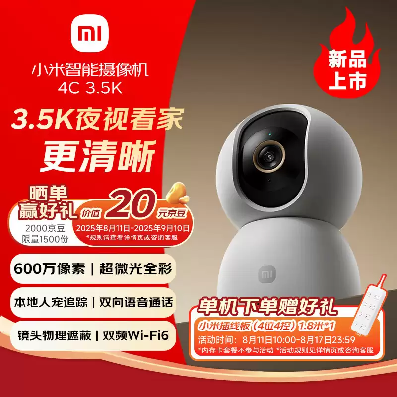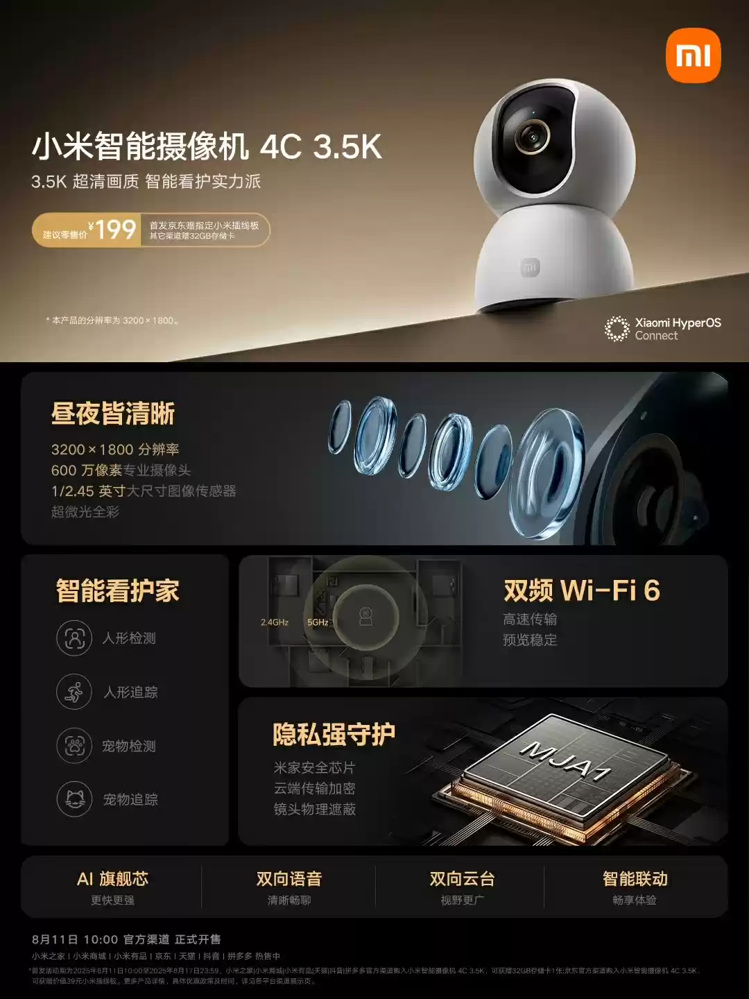 8 月 8 日消息,小米智能摄像机 4C 3.5K 现已上架京东等平台并开启预约,8 月 11 日早 10 点正式开售,建议零售价 199 元。