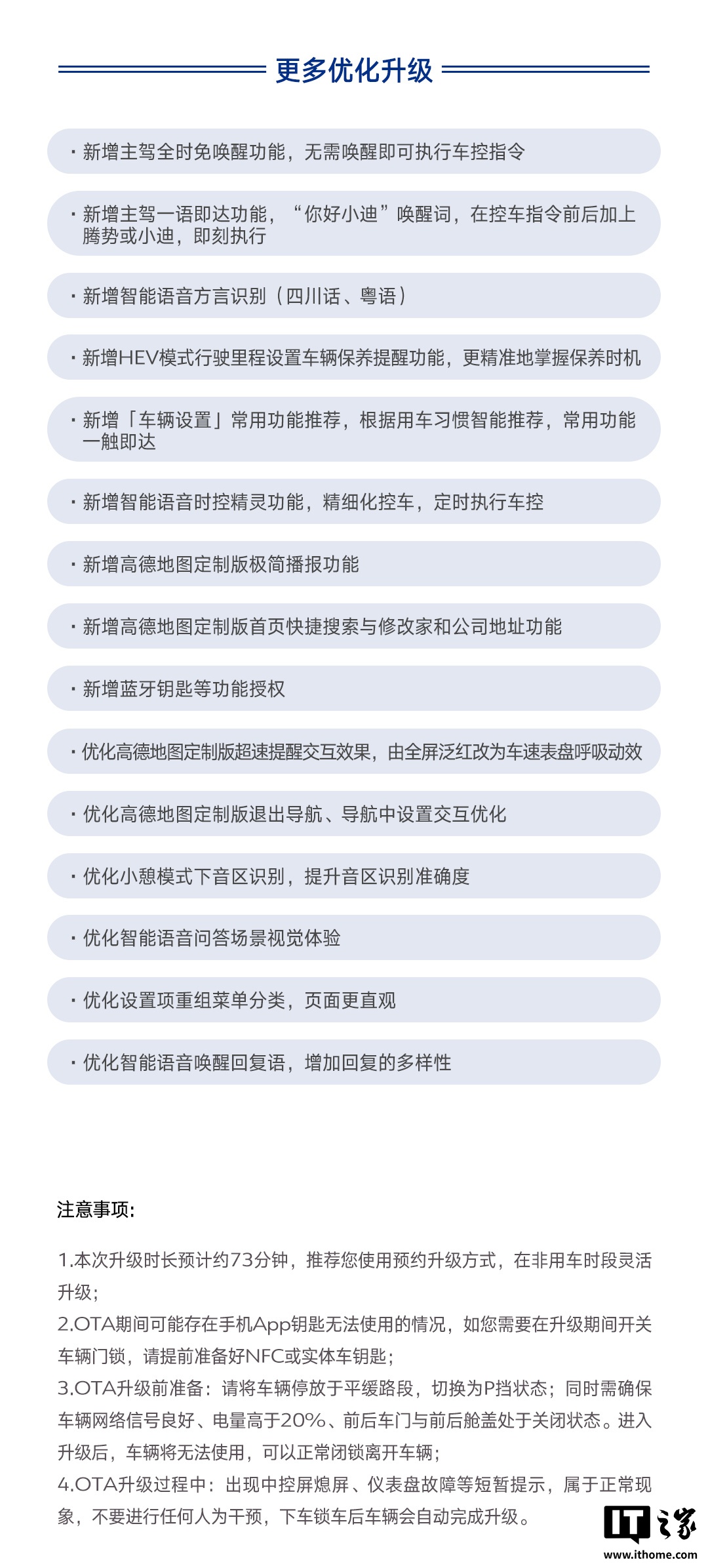 注意到,另外还有新增主驾全时免唤醒功能、新增主驾一语即达功能、新增智能语音方言识别(四川话、粤语)、新增 HEV 模式行驶里程设置车辆保养提醒功能、新增「车辆设置」常用功能推荐和新增智能语音时控精灵功能等等。