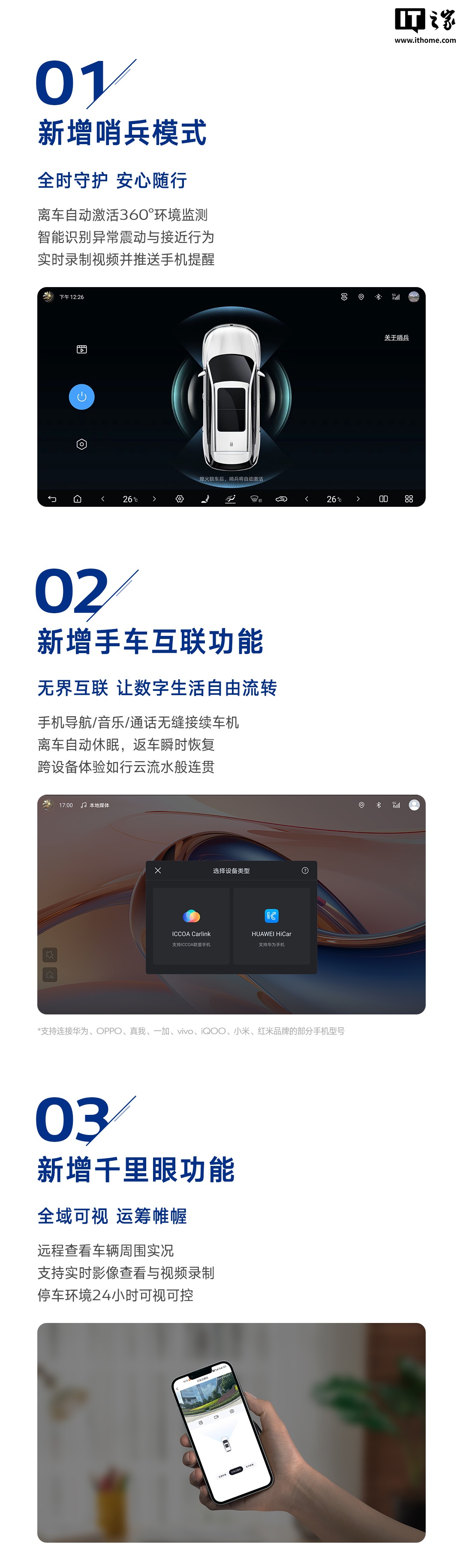 哨兵模式离车自动激活 360° 环境监测,智能识别异常振动与接近行为,实时录制视频并推送手机提醒;手车互联功能手机导航 / 音乐 / 通话无缝接续车机,离车自动休眠,返车瞬时恢复;千里眼功能远程查看车辆周围实况,支持实时影像查看与视频录制,停车环境 24 小时可视可控。