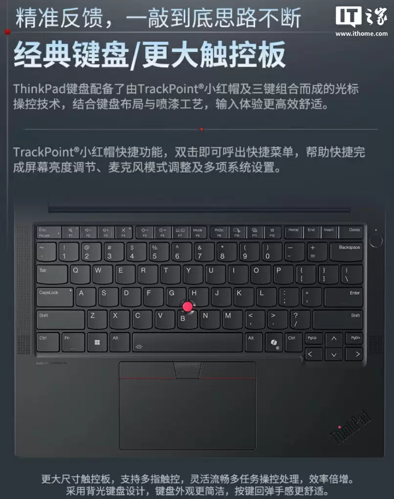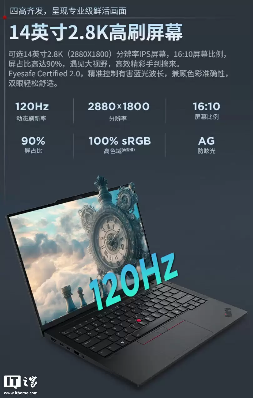 该机整体重量 1.32 千克,厚度 15.25mm;A 面带有 ThinkPad 高亮 Logo;B 面配备一块 14 英寸 2880x1800 分辨率 120Hz 面板(覆盖 100% sRGB 色域,亮度 400 尼特),采用俗称的“凸刘海”设计(匹配 FHD+IR 红外摄像头);C 面配备防泼溅键盘,带有 TrackPoint 小红帽设计。