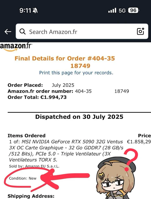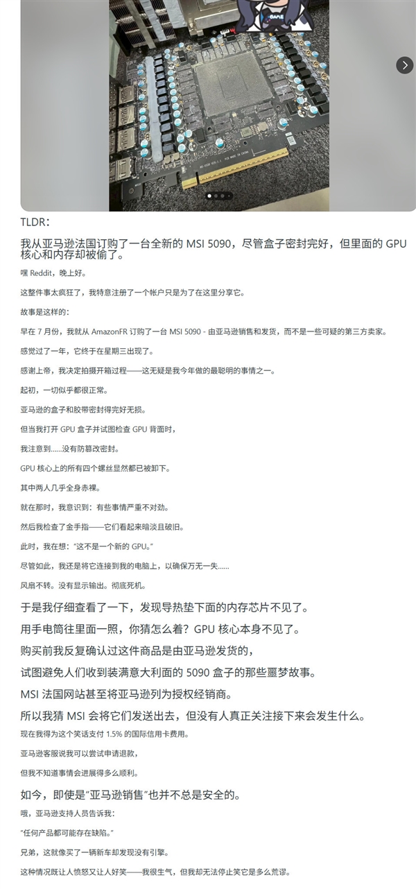 近日, Reddit网友pcmasterrace发帖称,他从亚马逊法国重金购买了一款全新的微星RTX 5090,由亚马逊销售和发货(非任何第三方卖家)。