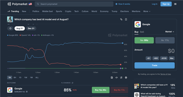 Polymarket上还发起了一个叫“哪家公司在八月末拥有最顶级的AI模型”的竞猜,结果就在发布会刚开完时,谷歌和OpenAI的赔率来了个两极反转。