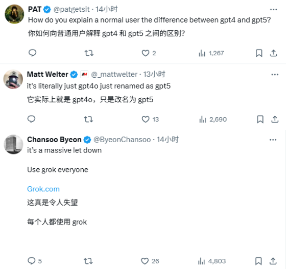 但从网友的反应看,不少人都在对这个船新版本GPT发出锐评,抱怨这玩意根本就不是GPT-5,还不如grok。