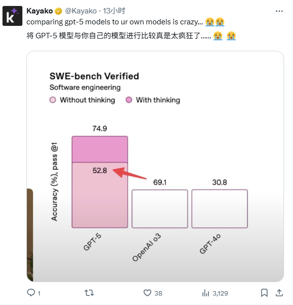 最搞的是,在发布会的时候,OpenAI放了张柱状图,在比较大模型写代码的准确度时,52.8%画得比69.1%还高,小学生都画不出来,这一波黑子白子都洗不了了。。