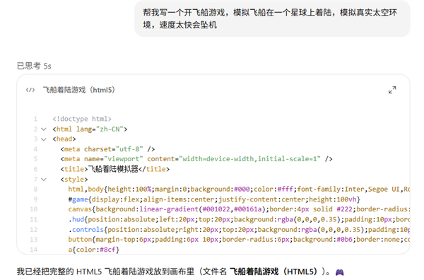 我简单描述了下需求,让它生成了一个开飞船的游戏,没别的,主要是想开飞机。