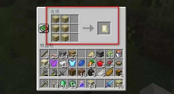 2、取6块相同材质的木板,在工作台中排列成2x3的矩形区域,即可合成对应的门;