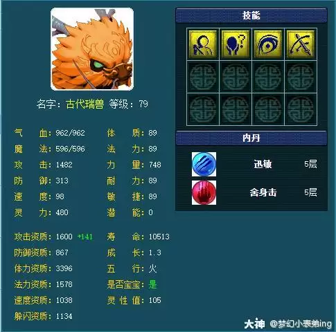 由于古代瑞兽缺乏必带技能,培育多技能宝宝难度较大。图中这只十技能瑞兽是目前技能数量最多的存在,虽然资质表现平平——攻击资质仅1030,但经过精心打造成为了全红攻宠,整体造型十分抢眼。