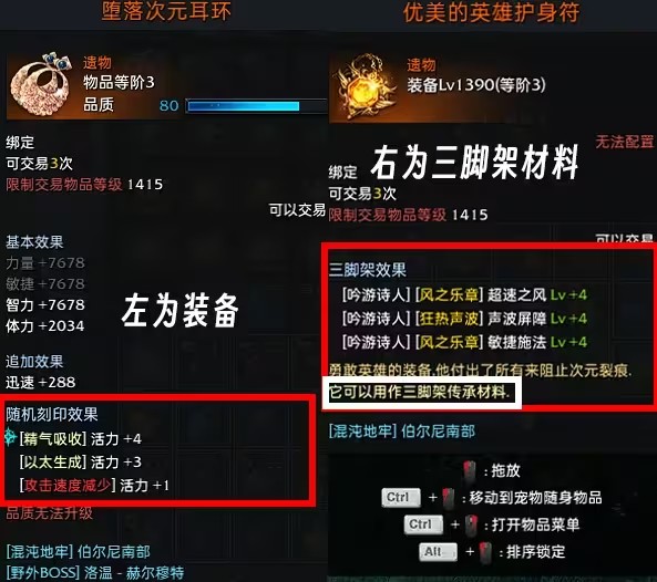 如何分辨装备和护身符的可以查看上图中的红框中的显示。装备为刻印效果,护身符为三脚架效果,且会标注出“它可以用作三脚架传承材料”。