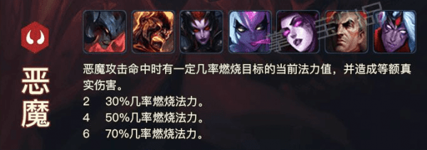 6个-恶魔的攻击有70%几率灼烧一名敌人的所有法力值并造成等额的真实伤害。