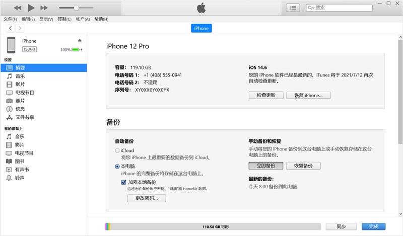 在 Windows PC 上,打开 iTunes,并使用 USB 连接线将您的设备连接到电脑。如果系统提示您输入设备密码或 “信任此电脑”,请按屏幕上显示的步骤操作。在 iTunes 中选择您的设备,点按 “摘要”。如果要存储您的设备或 Apple Watch 上的 “健康” 和 “健身记录” 数据,您需要对备份进行加密。选中 “加密本地备份” 复选框,然后创建一个容易记住的密码。将密码写下来妥善保管,因为没有这个密码将无法恢复 iTunes 备份。点按 “立即备份”。备份过程结束后,您可以查看备份是不是已成功完成。