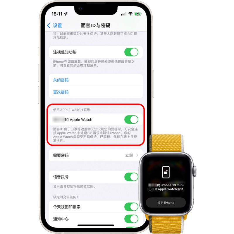 戴着口罩时通过 Apple Watch 解锁 iPhone 的功能是随着今年四月的 iOS 14.5 以及 watchOS 7.4 推出。此功能需要使用面容 ID(iPhone X 或更新机型)并装有 iOS 14.5 或更高版本的 iPhone,以及装有 watchOS 7.4 或更高版本的 Apple Watch Series 3 或更新机型。该功能可在戴着口罩并佩戴 Apple Watch 的情况下,只需抬起 iPhone 并看一眼 iPhone 就能解锁。在需要戴口罩的使用场景中很实用。具体所需条件及设置方法可参阅 Apple 支持文章:戴着口罩时通过 Apple Watch 解锁 iPhone ——Apple 支持。