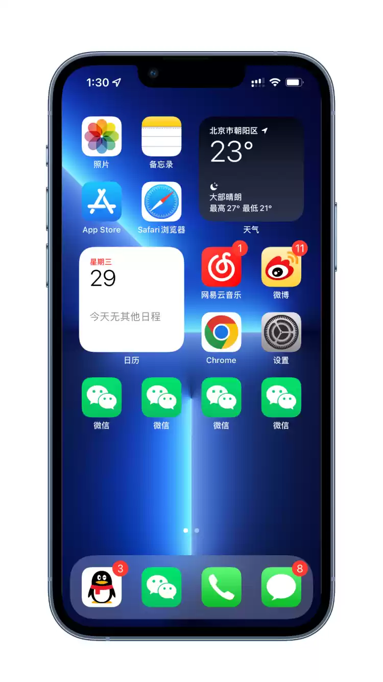 在 iOS 的资源库中,我们可以在同一个页面中放置两个相同的应用图标,也就是说,我们可以 DIY 出不同的专属应用页面。