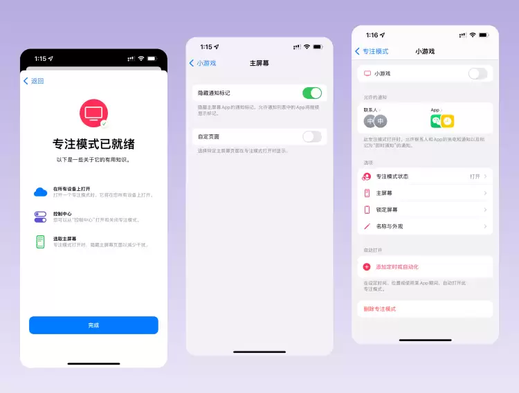 当我们做到这一步之后,就迎来了非常关键的“专注模式”的设置。我们可以在专注模式中单独设置一个“游戏模式”,在这个模式中,我们设置仅显示被我们隐藏的游戏桌面。