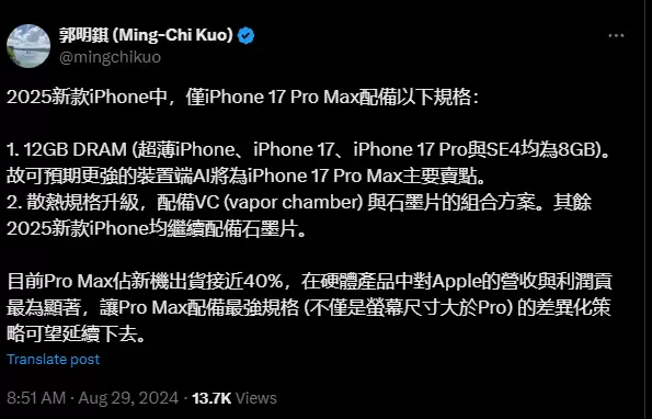 得益于全新散热系统的加持,iPhone 17 Pro Max将实现前所未有的性能表现,不仅将独家配备12GB大内存,在AI计算能力方面也会获得显著提升。