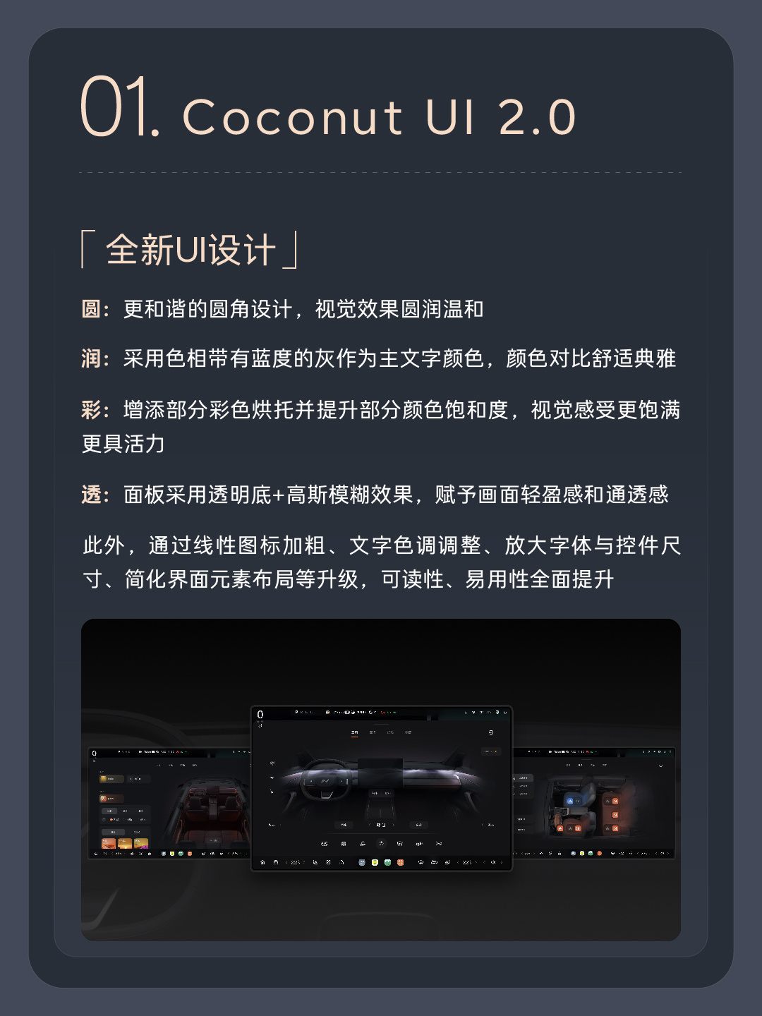 Coconut UI 2.0 版本在设计上采用了更和谐的圆角设计,视觉效果更加圆润温和。新 UI 采用带有蓝度的灰色作为主文字颜色,颜色对比舒适典雅。此外,新版本还增加了部分彩色烘托,提升了部分颜色饱和度,使视觉效果更加饱满且更具活力。面板采用透明底 + 高斯模糊效果,赋予画面轻盈感和通透感。此外,通过线性图标加粗、文字色调调整、放大字体与控件尺寸、简化界面元素布局等升级,可读性、易用性全面提升。