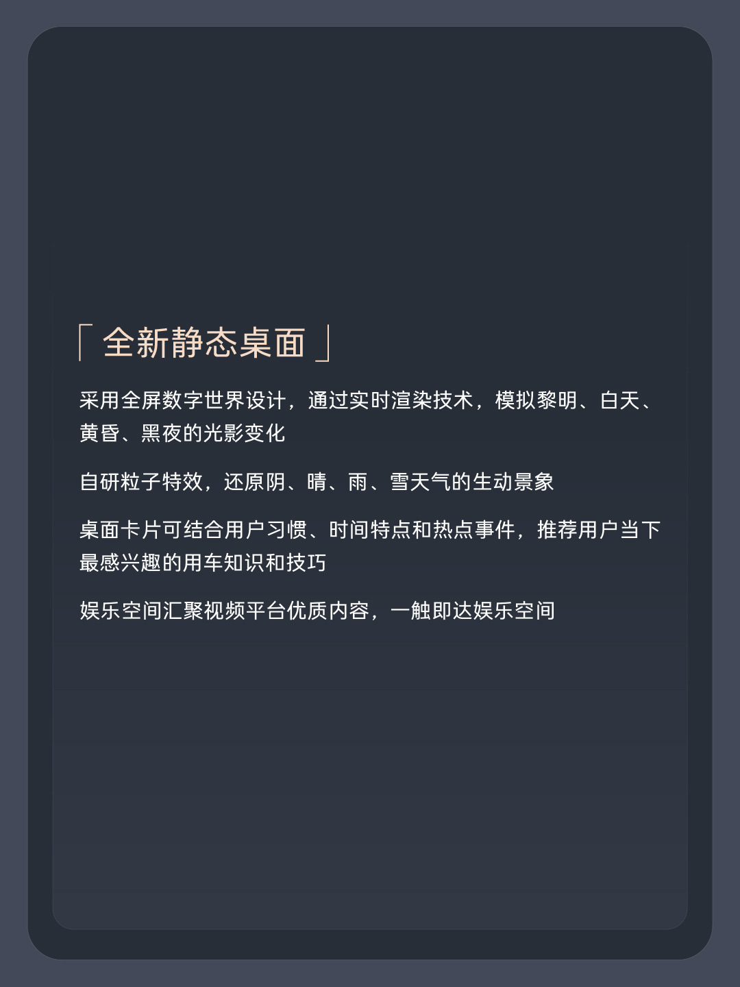 全新静态桌面采用全屏数字世界设计,通过实时渲染技术,模拟黎明、白天、黄昏、黑夜的光影变化。自研粒子特效,还原阴、晴、雨、雪天气的生动景象。桌面卡片可结合用户习惯、时间特点和热点事件,推荐用户当下最感兴趣的用车知识和技巧。娱乐空间汇聚视频平台优质内容,一触即达娱乐空间。