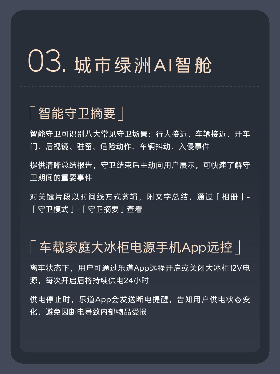 智能守卫可识别八大常见守卫场景:行人接近、车辆接近、开车门、后视镜、驻留、危险动作、车辆抖动、入侵事件。提供清晰总结报告,守卫结束后主动向用户展示,可快速了解守卫期间的重要事件。对关键片段以时间线方式剪辑,附文字总结,通过「相册」-「守卫模式」-「守卫摘要」查看。