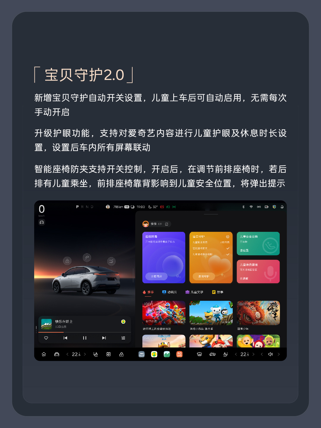 新增宝贝守护自动开关设置,儿童上车后可自动启用,无需每次手动开启。升级护眼功能,支持对爱奇艺内容进行儿童护眼及休息时长设置,设置后车内所有屏幕联动。智能座椅防夹支持开关控制,开启后,在调节前排座椅时,若后排有儿童乘坐,前排座椅靠背影响到儿童安全位置,将弹出提示。