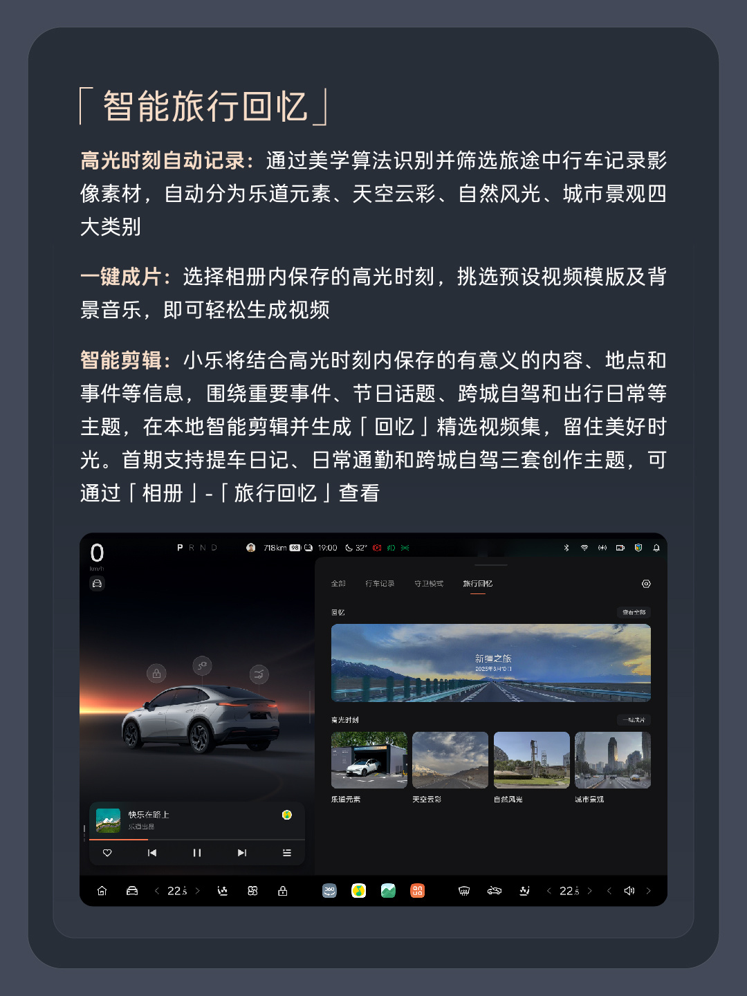 高光时刻自动记录:通过美学算法识别并筛选旅途中行车记录影像素材,自动分为乐道元素、天空云彩、自然风光、城市景观四大类别。一键成片:选择相册内保存的高光时刻,挑选预设视频模版及背景音乐,即可轻松生成视频。智能剪辑:小乐将结合高光时刻内保存的有意义的内容、地点和事件等信息,围绕重要事件、节日话题、跨城自驾和出行日常等主题,在本地智能剪辑并生成「回忆」精选视频集,留住美好时光。首期支持提车日记、日常通勤和跨城自驾三套创作主题,可通过「相册」-「旅行回忆」查看。