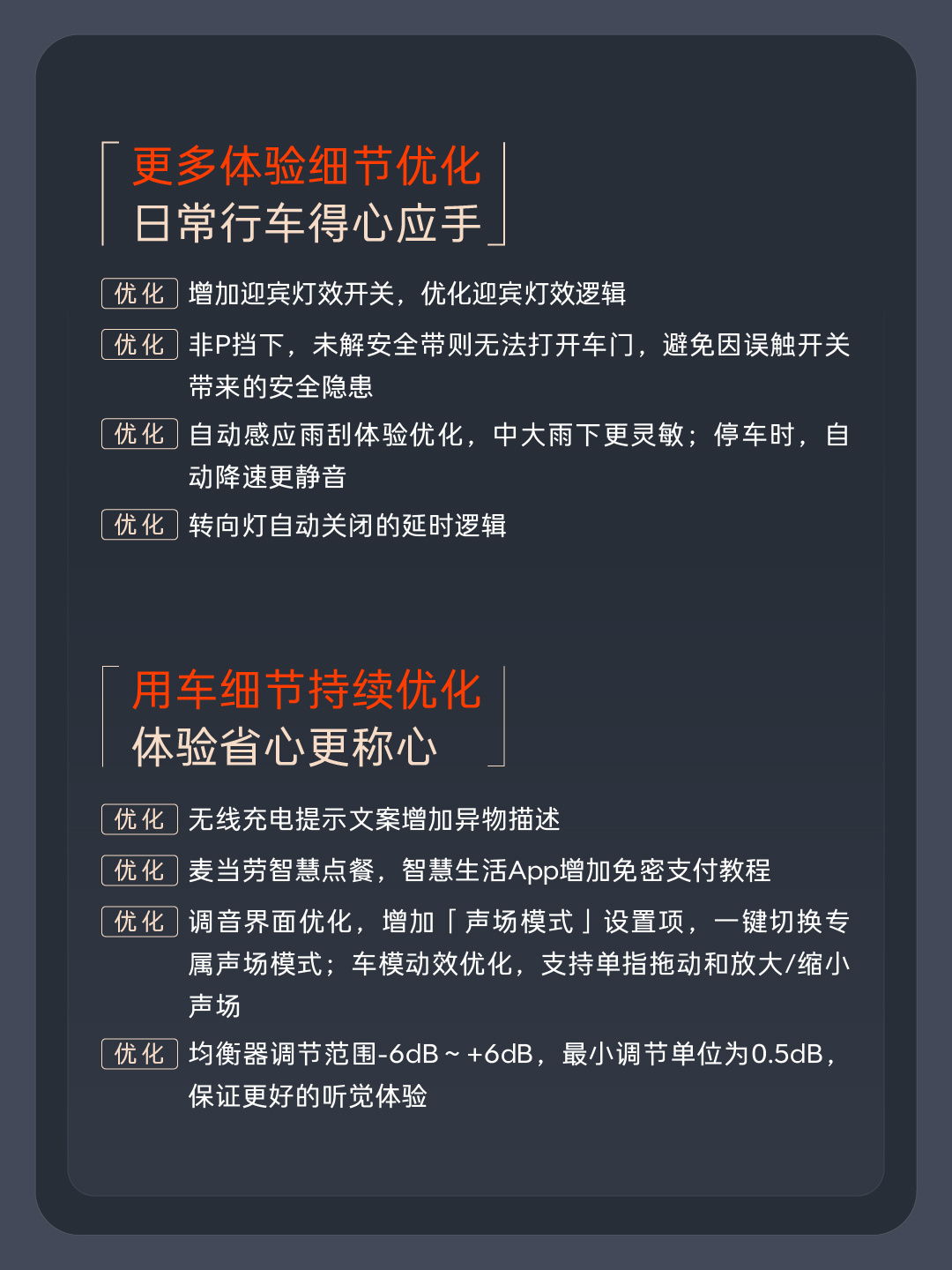 无线充电提示文案增加异物描述。麦当劳智慧点餐,智慧生活 App 增加免密支付教程。调音界面优化,增加「声场模式」设置项,一键切换专属声场模式;车模动效优化,支持单指拖动和放大 / 缩小声场。均衡器调节范围-6dB~+6dB,最小调节单位为 0.5dB,保证更好的听觉体验。
