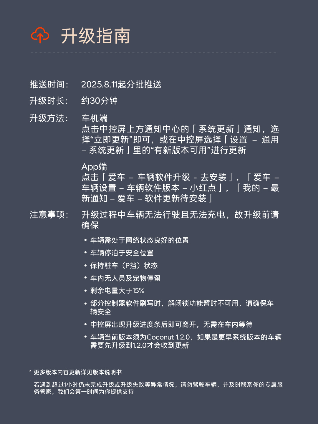 注意事项:升级过程中车辆无法行驶且无法充电,故升级前请确保车辆需处于网络状态良好的位置,车辆停泊于安全位置,保持驻车(P 挡)状态,车内无人员及宠物停留,剩余电量大于 15%,部分控制器软件刷写时,解闭锁功能暂时不可用,请确保车辆安全。中控屏出现升级进度条后即可离开,无需在车内等待。车辆当前版本须为 Coconut 1.2.0,如果是更早系统版本的车辆需要先升级到 1.2.0 才会收到更新。