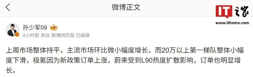 8月11日,知名汽车博主@孙少军09发布最新市场观察:上周整体车市表现平稳,主流细分市场呈现小幅环比增长态势。值得注意的是,20万元以上高端市场的主力品牌销量出现轻微回落,其中极氪凭借新政刺激实现订单逆势上扬,而蔚来则受益于乐道L90持续升温的市场热度,订单量同样迎来显著提升。