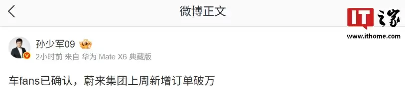 该博主进一步披露:蔚来集团上周新增订单突破10000台大关,展现出强劲的市场表现。