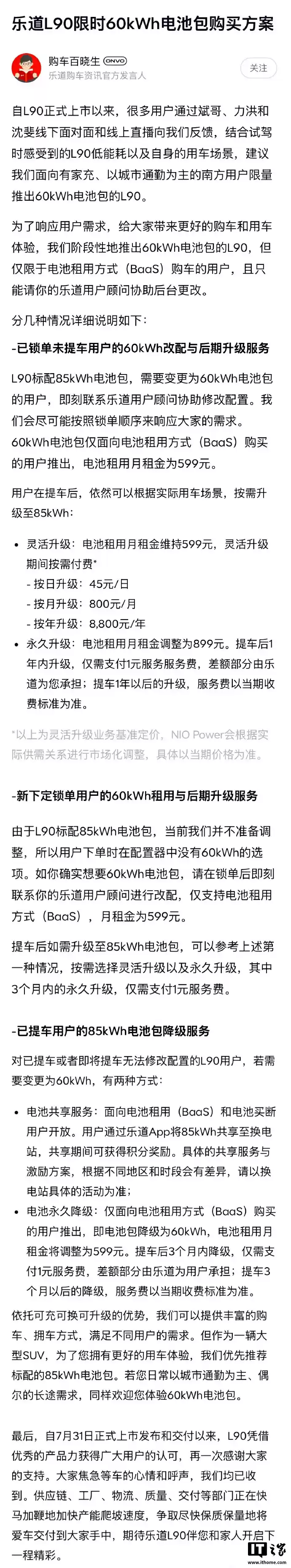 乐道L90推出60度电池包租赁方案,月租599元灵活升级