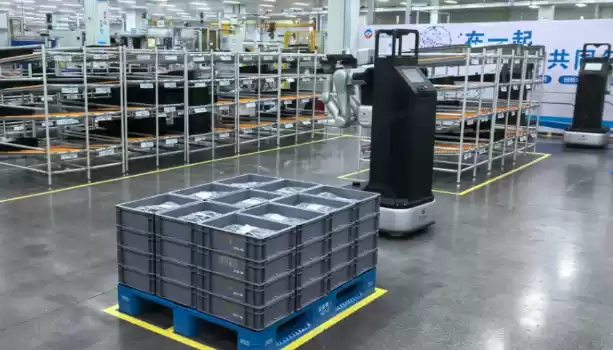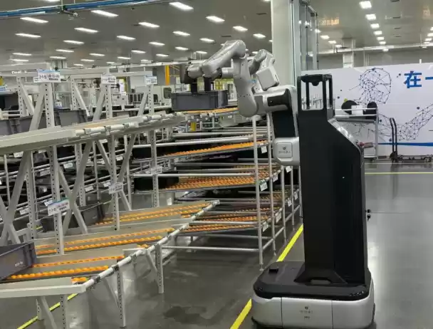 此次合作采用“具身机器人 + AMR”构建了深度协同系统,其中具身机器人 A2-W 负责多层料架周转箱取放,AMR 负责车间内重载整托物料运输。依托生产系统的智能派单与动态叫料机制,AMR 将物料从拣选室配送至线边上料点,具身机器人 A2-W 可自动识别箱体、自主调整姿态,完成拆垛上料及空箱回收,实现从物料出库、产线上料、空箱回收流转的全流程作业。