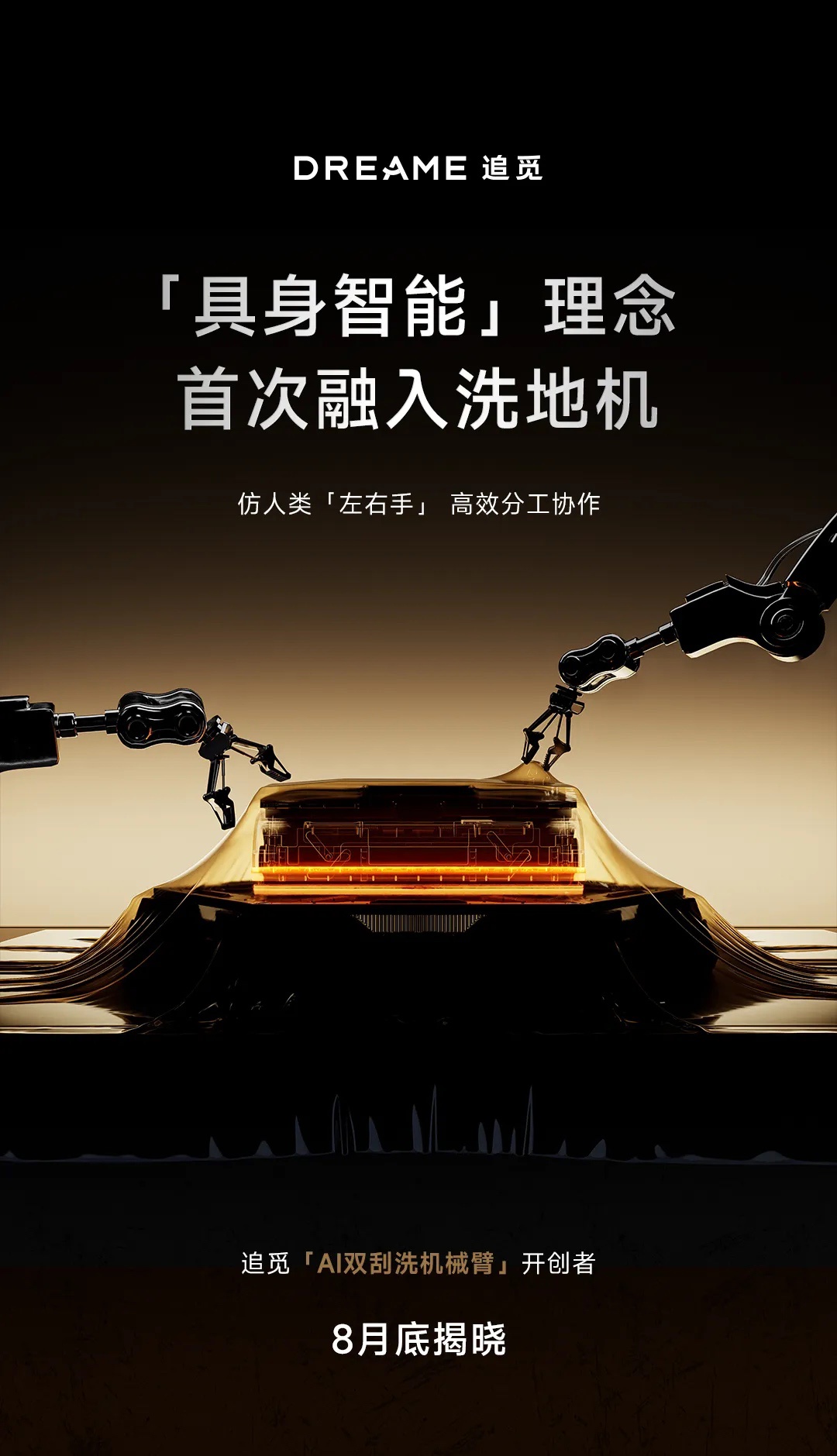8 月 11 日消息,追觅科技发文,透露将于本月底发布“全球首款双机械臂洗地机器人”,相应产品号称在 AI 具身智能加持下可实现类似人类动作逻辑的“双臂协作”,实现更加高效的清洁效果。