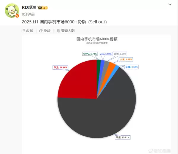 8月11日,有数码博主发布了2025年上半年中国手机市场6000元以上价位段的市场份额数据,苹果以近2/3的绝对优势领跑高端市场。