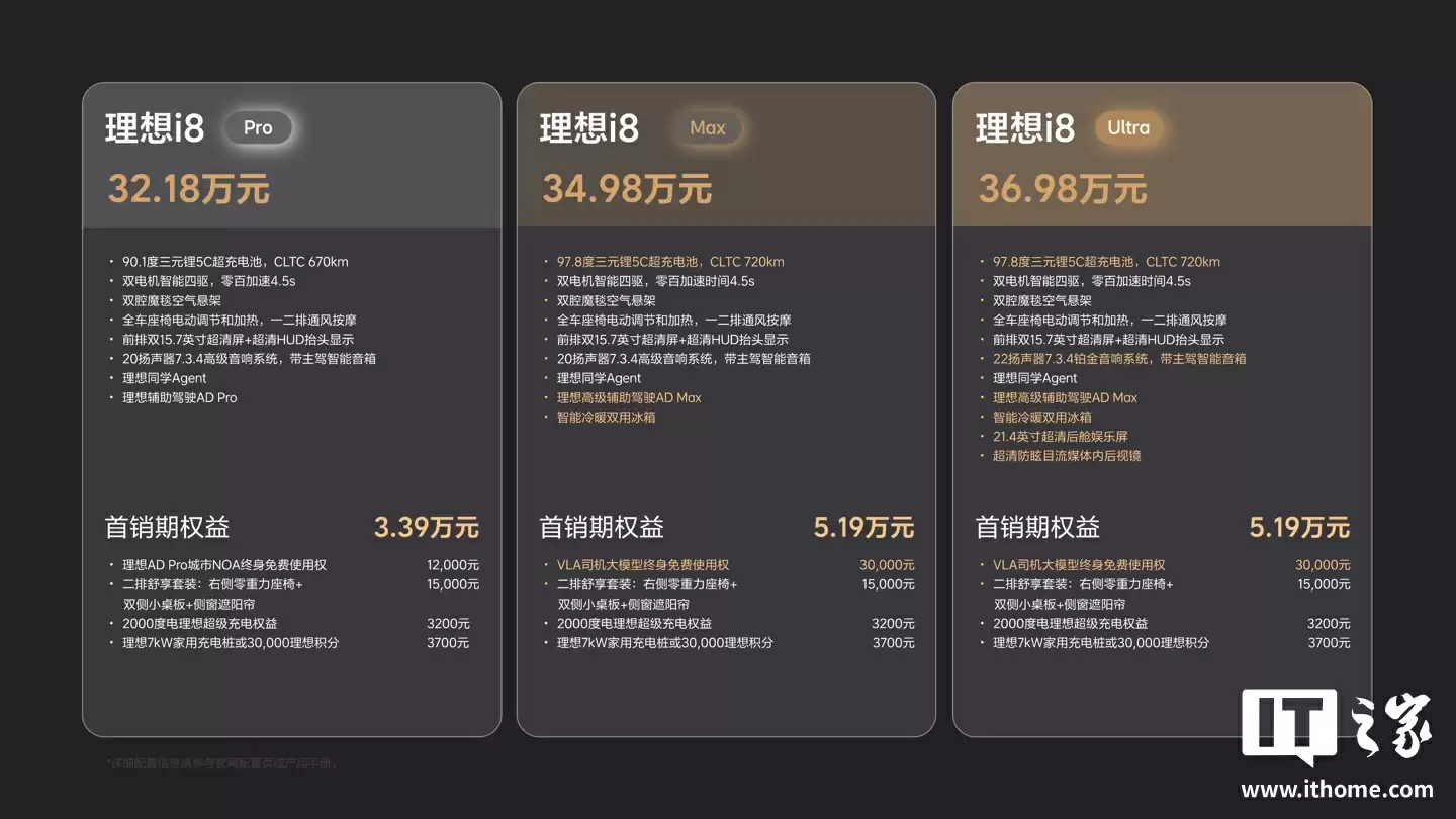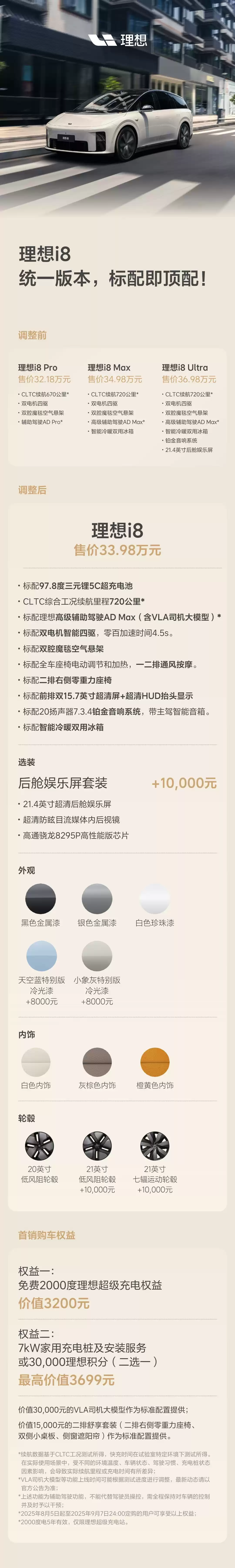 以理想 i8 Max 作为标准配置,并将售价从 34.98 万元调整为 33.98 万元,同时额外赠送价值 10,000 元的铂金音响,并提供后舱娱乐屏套装作为选装,价格 10,000 元;