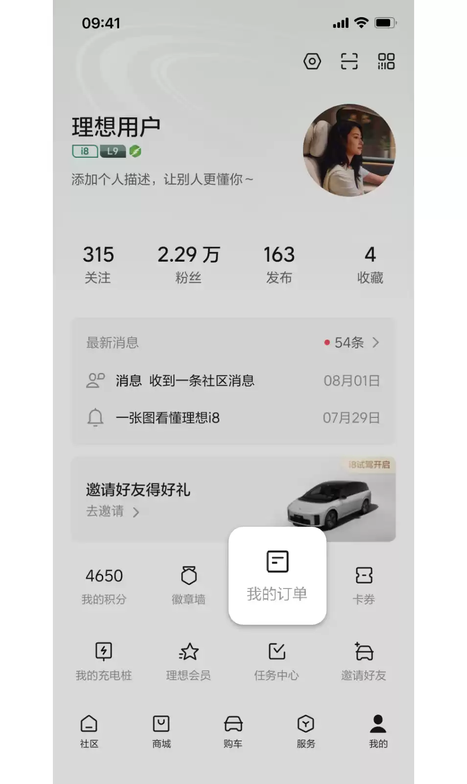 打开理想汽车 App,在「我的」板块中点击「我的订单」。