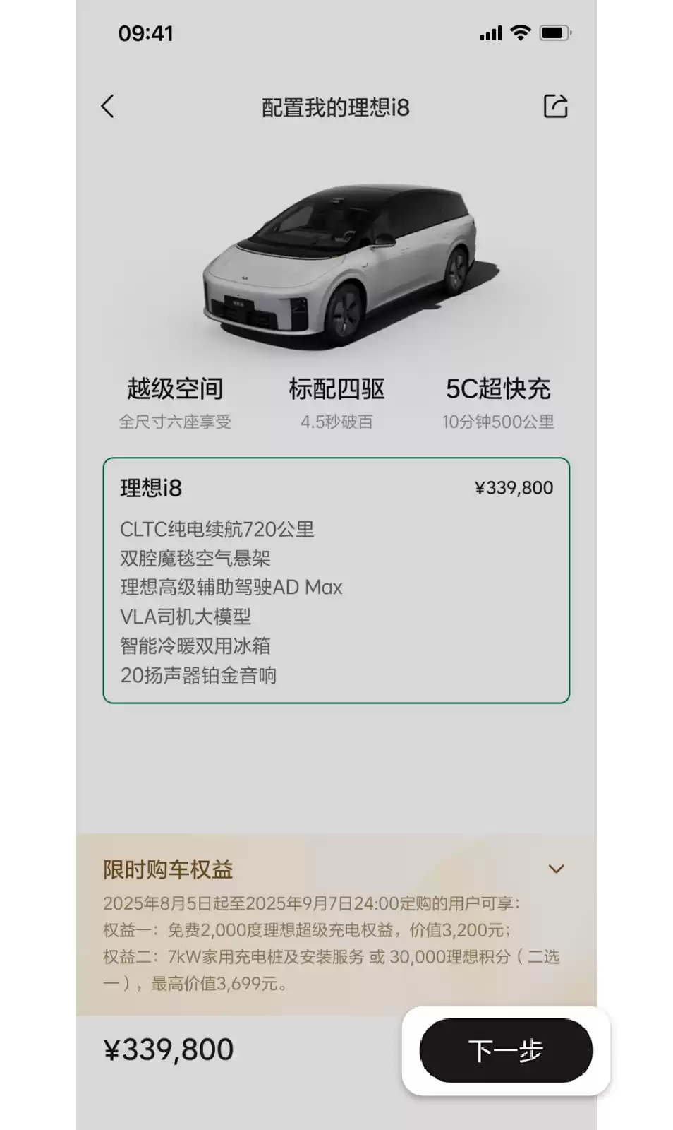 理想 i8 推出了全新的价格和配置组合,原购车权益中的二排舒享套装(二排右侧零重力座椅、侧窗遮阳帘、双侧小桌板)和 VLA 司机大模型已经作为标准配置提供给定购用户,2000 度电理想超级充电权益和理想 7kW 家用充电桩及安装服务(或 30,000 理想积分)仍然保留。